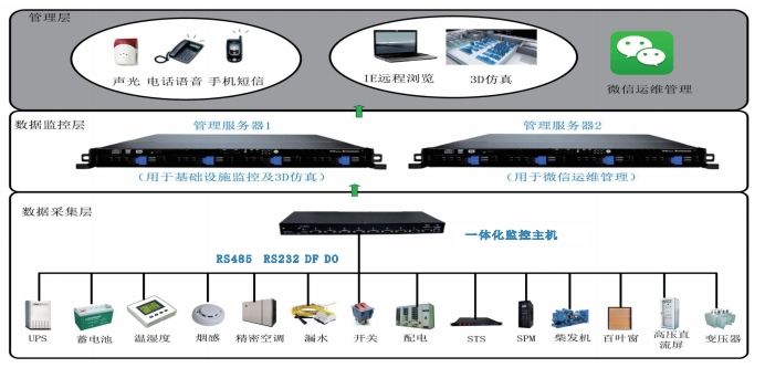 機房動環綜合監管系統是一個綜合應用計算機網絡、物聯網、云計算、無線通信、自動控制等技術構成的管理系統,以計算機技術為基礎、基于集中管理監控模式的自動化、智能化和高效率的技術手段針對機房的動力、環境、消防、網絡、安防等系統的監控,實現遠程運維。