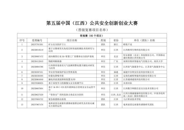 關于公布第五屆中國(江西)公共安全創新創業大賽晉級復賽項目名單的通知
