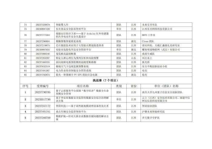 按照江西省科技廳等單位聯合印發的《關于舉辦第五屆中國(江西)公共安全創新創業大賽的通知》精神,大賽組委會組織開展了第五屆中國(江西)公共安全創新創業大賽申報受理工作,共受理181項有效項目,其中常規賽項目166項,挑戰賽項目15項。根據《第五屆中國(江西)公共安全創新創業大賽評審遴選方案》,經組織專家評審,依據評分高低從166項常規賽項目中遴選85項、15項挑戰賽項目中遴選7項共92項晉級復賽。
